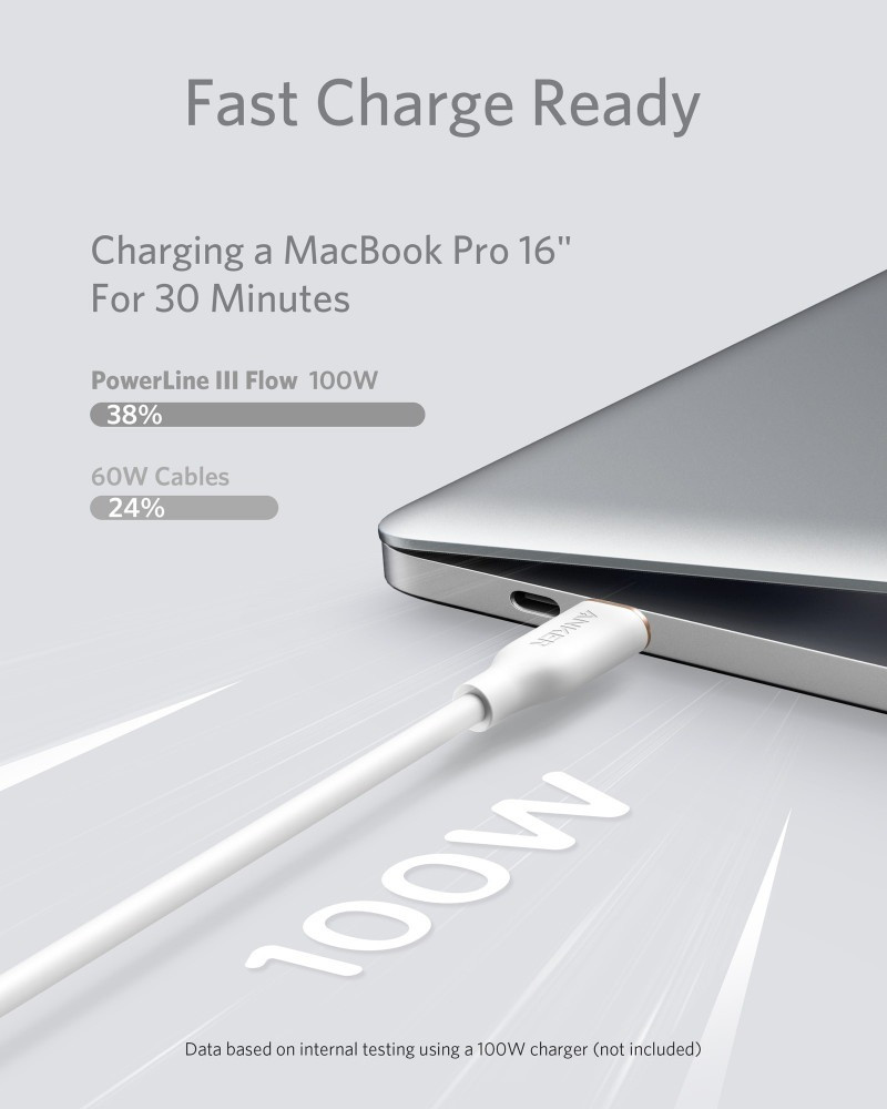 يدعم طاقة بحد أقصى 100 واط عند إقرانه بشاحن حائط بقوة 100 واط أو أعلى لتشغيل أي جهاز USB-C تقريبًا ، بما في ذلك الهواتف والأجهزة اللوحية وأجهزة الكمبيوتر المحمولة. (لا يدعم هذا الكبل عرض الوسائط.)